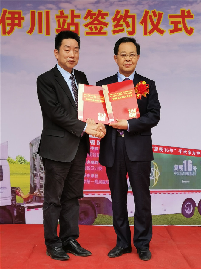 2019年4月19日,中國復明扶貧流動眼科手術車河南新複明16號伊川站啟動儀式暨鄭州大學第一附屬醫院與伊川縣慈善醫院光明行動聯盟簽約儀式,在伊川縣慈善醫院舉行。本會會長及行政總裁陳梁悅明太平紳士,全國最美醫生、百歲眼科泰斗張效房教授,河南省衛健委國際合作處副處長任偉先生,鄭大一附院副院長苟建軍先生、河南省眼科醫院副院長呂勇教授、張鳳妍教授、伊川縣領導韓燦秋、姜斌、伊川縣慈善醫院院長劉運甲先生等出席當天的啟動儀式。